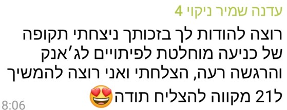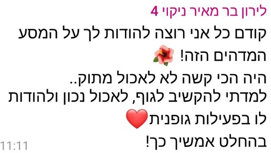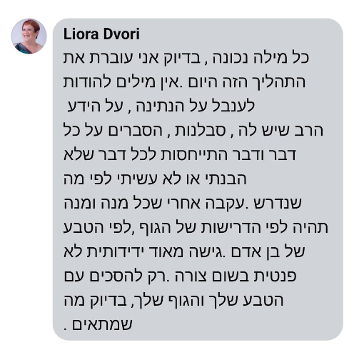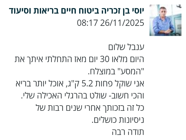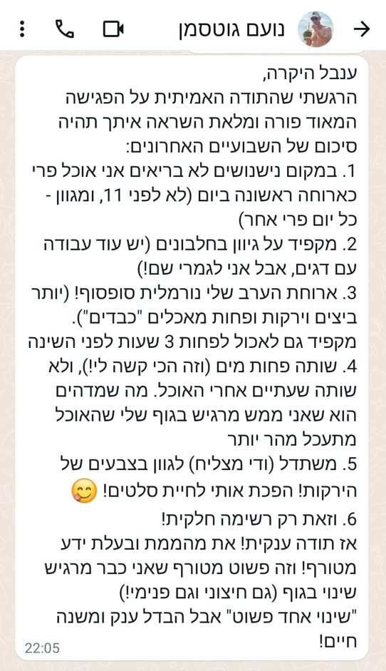המפגשים איתך היו באווירה נעימה עם חיוך תמידי שלך, בכל מפגש למדנו משהו חדש שלא ידענו קודם או שידענו ולא נתנו עליו את הדעת. אני לא רגיל שיאמרו לי מה לעשות ואיך לאכול ומתי, ומצאתי את עצמי אחרי 2-3 מפגשים מנסה ליישם את שהטפת לי, בנועם, ושאלתי את עצמי מה כבר יכול להיות אנסה.