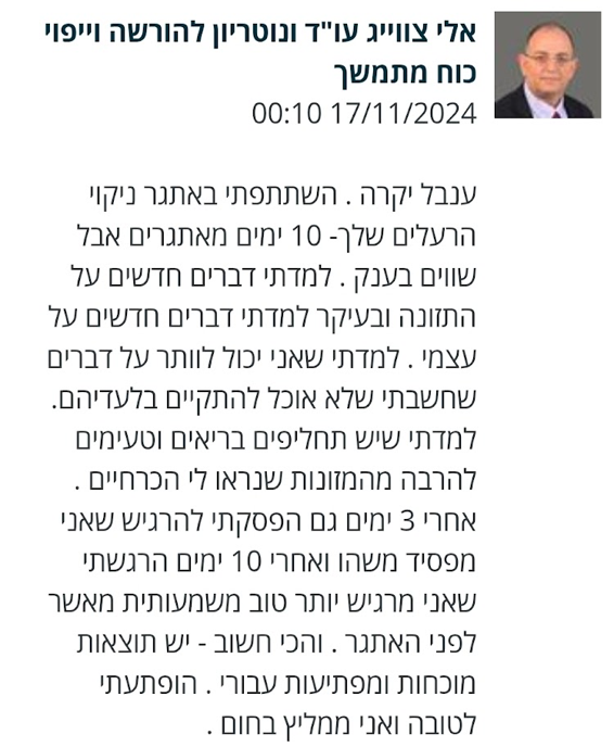 זה לא היה קל אך היה מועיל, לא מבטיח ולא מתחייב לעשות ולהכניס את עצמי למשטר שכיוונת אותי אליו, אך אני מודיע לך שהבנתי וקבלתי את העקרונות, אשתדל בעתיד לפעול על פיהם, אני בטוח שלא בכל העקרונות ולא כל הזמן, אבל למדתי מימך הרבה ואני מאמין שאם אבצע אפילו רק חלק מהם איכות החיים שלי תשתפר.