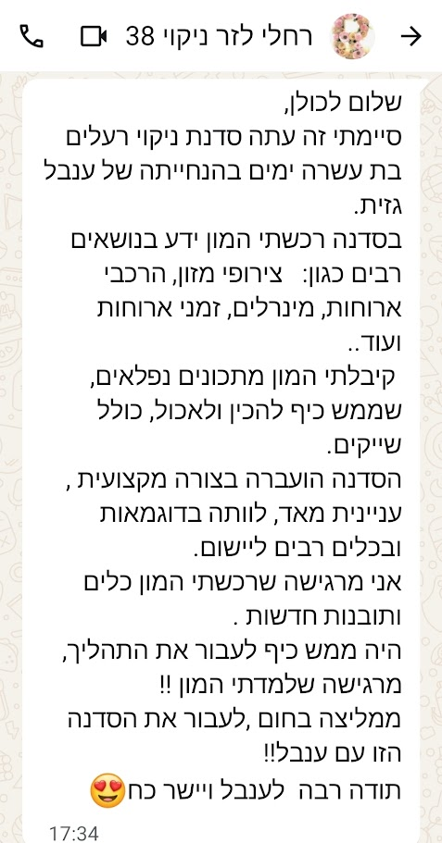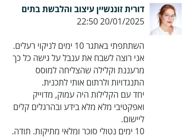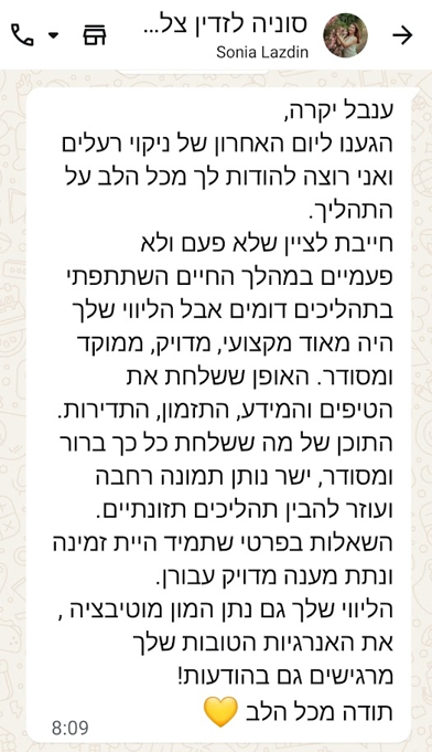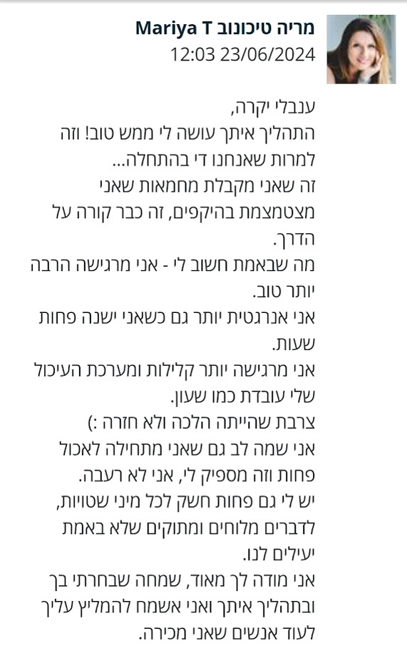 עוד כשהתחלנו את דרכנו המשותפת בתהליך ניקוי הרעלים שאת מלווה בו את לקוחותייך, נוכחתי לגלות עד כמה את מקצועית ונעימה, ובכך התהליך עבורי היה מוצלח ביותר, והיווה את יריית הפתיחה לתהליך המשותף שלנו.
