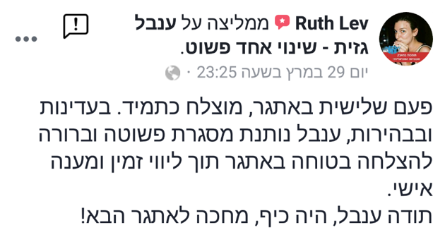 לפני כמה חודשים התחלתי תהליך שכלל שינוי תזונתי עם ענבל המהממת מגן יבנה. בדיקת הA1c שלי הראתה 6.1. ענבל "התעקשה" שזה מעט גבוה. בהמשך המשכתי באופן עצמאי לאכול בריא ולהתעמל הרבה והיום בדיקת הדם הA1c שלי הראתה 5.7 !!!! אין ספק שינוי לטובה ….והכול בזכות ענבל והליווי שלה , מקצוענית אמיתית 💖💖💖💖