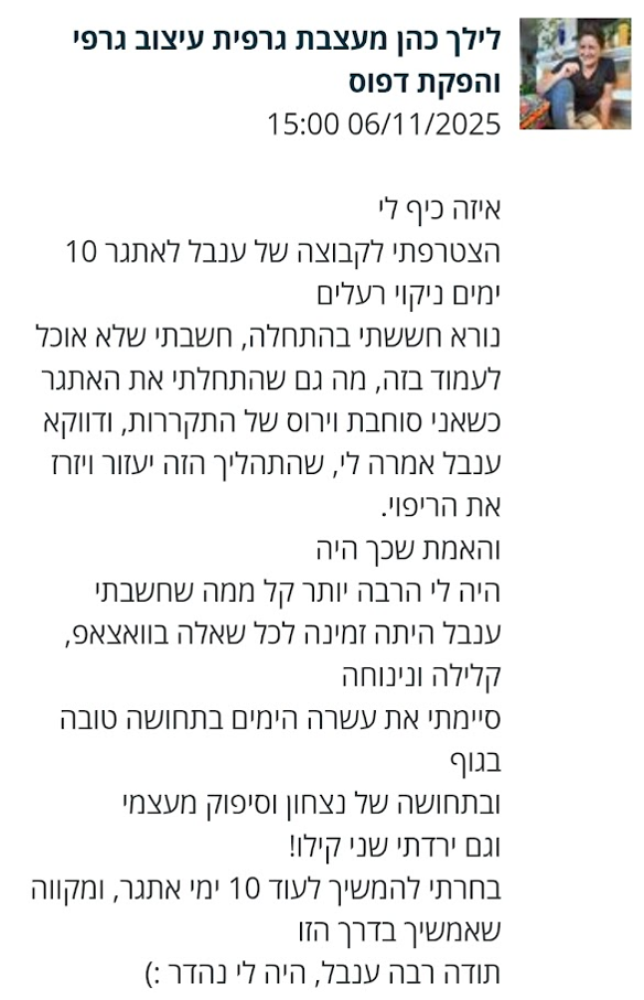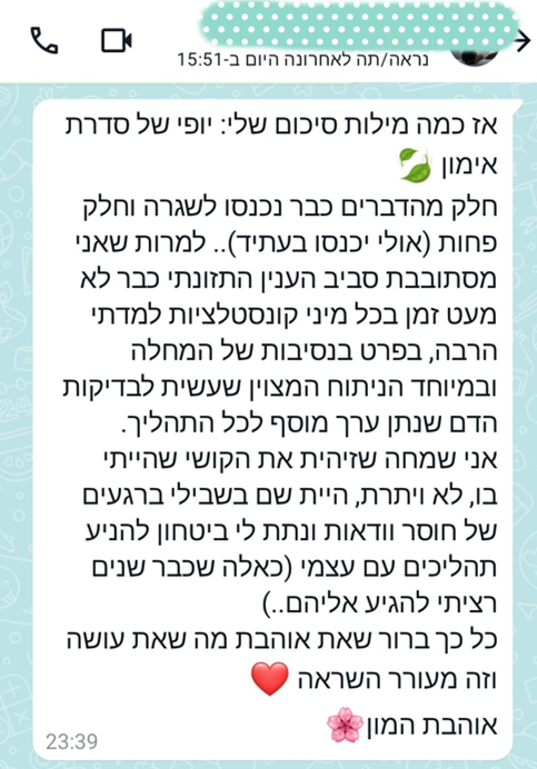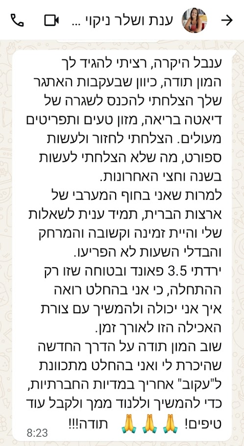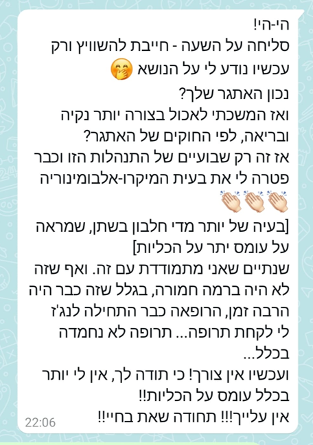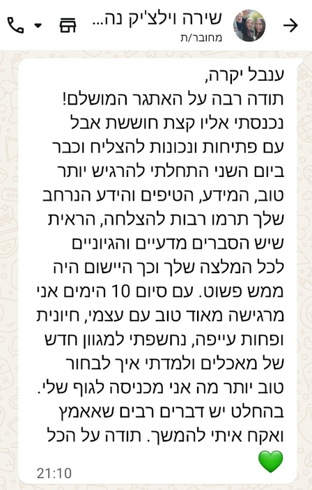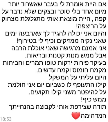 בהמשך, נעזרתי בך רבות בכל הקשור לשאלות שצצו תוך כדי שמירה על אורח חיים בריא אותו התחלתי לסגל. תמיד נתת מענה מיידי וסובלני לשאלותיי, ותמכת בתהליך לא פשוט זה.