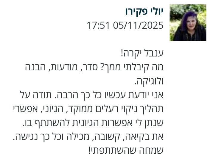 את מרצה נעימה בעלת רוח טובה ונכונות ומסירות להעניק מהידע הרב שצברת. בגישה רגישה גרמת לנו להיפתח ולשתף ועמדת לרשותינו בכל תהליך ההבנה.
