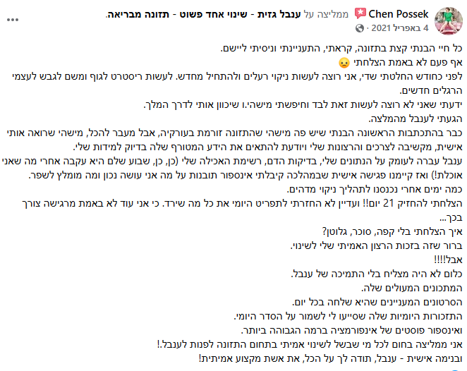 אז תודה לך עינבל על המפגשים ועל שהצלחת היכן שאחרים לא הצליחו לגרום לי לשנות קצת ממנהגי בנושא התזונה והזזת הגוף.